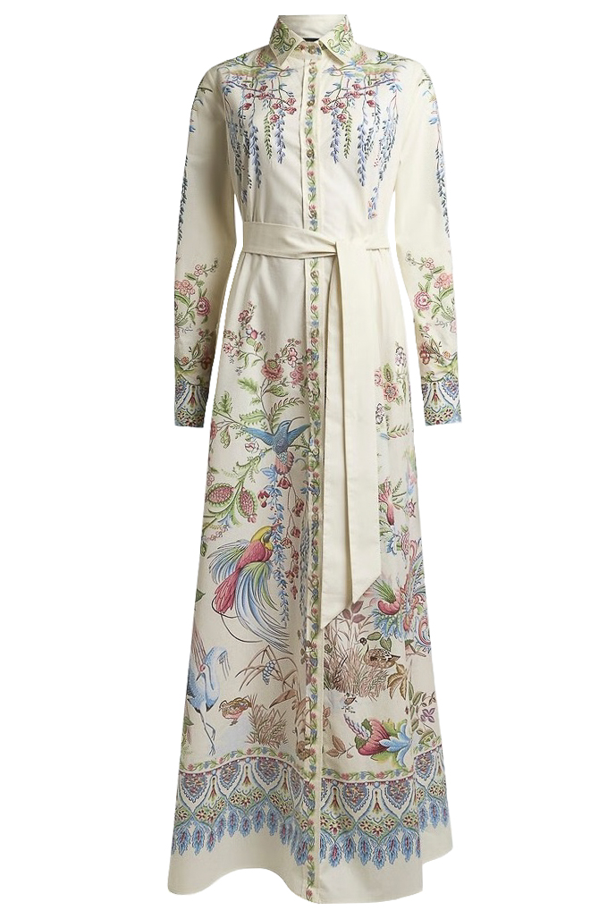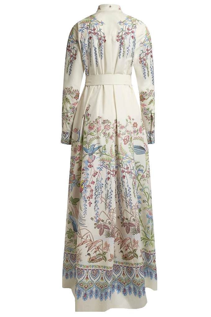 Abito lungo chemisier in cotone con stampa piazzata flora e fauna